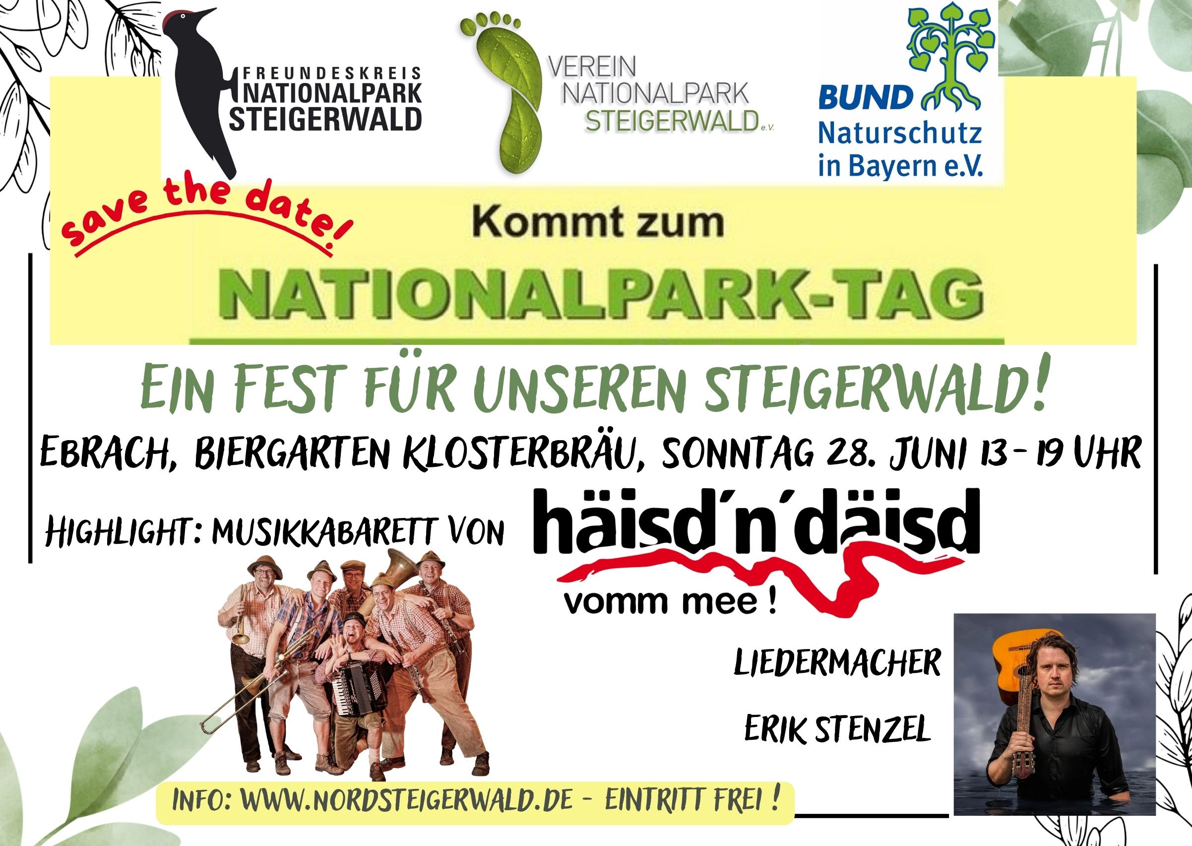 Für musikalische Stimmung sorgen bekannte Musikgruppen. An zahlreichen Ständen kann man sich zum Steigerwald, zu Nationalparks und vielen Umweltthemen informieren. Auch lokale Marktstände sind vor Ort und für Kinder ist einiges geboten. Für das leibliche Wohl sorgt die Klosterbräu-Gastronomie. Vormittags gibt es eine Exkursion im Steigerwald und eine Radtour von Bamberg nach Ebrach von BUND Naturschutz + VCD. Für das leibliche Wohl sorgt die Klosterbräu-Gastronomie.