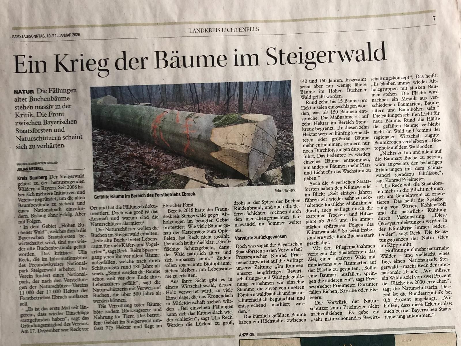 - Ein Krieg der Bäume im Steigerwald, Fränkischer Tag vom 10.1.26; Die Fällungen alter Buchenbäume stehen massiv in der Kritik. Die Front zwischen Bayerischen Staatsforsten und Naturschützern scheint sich zu verhärten.